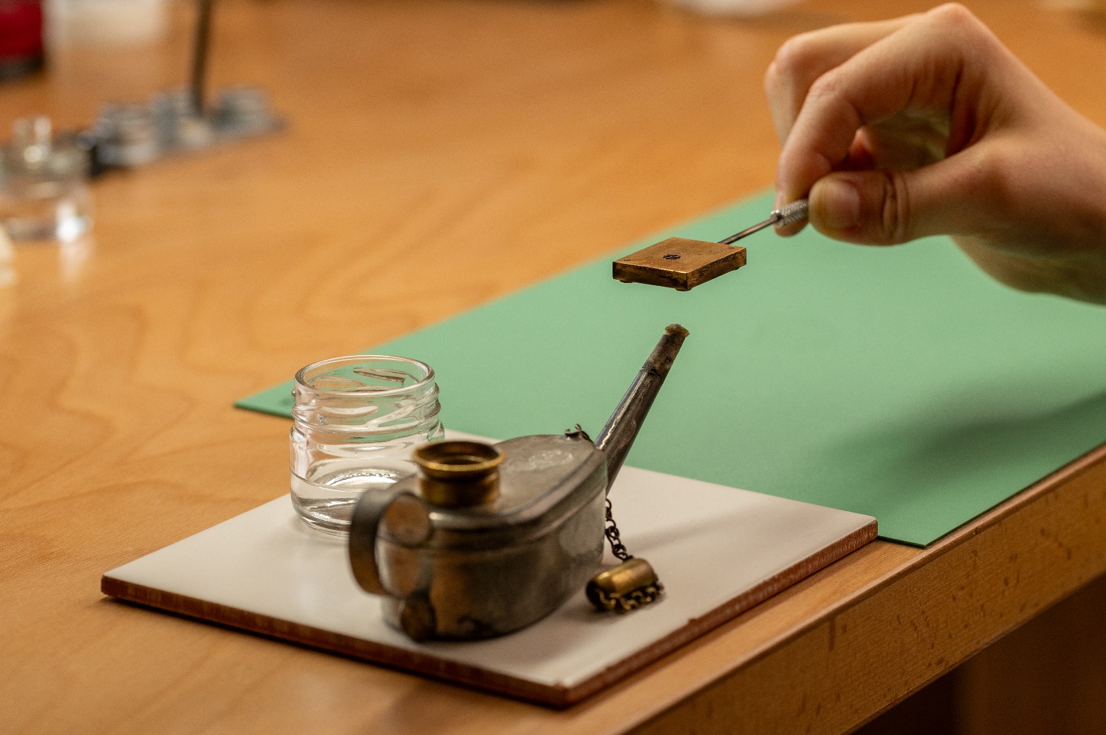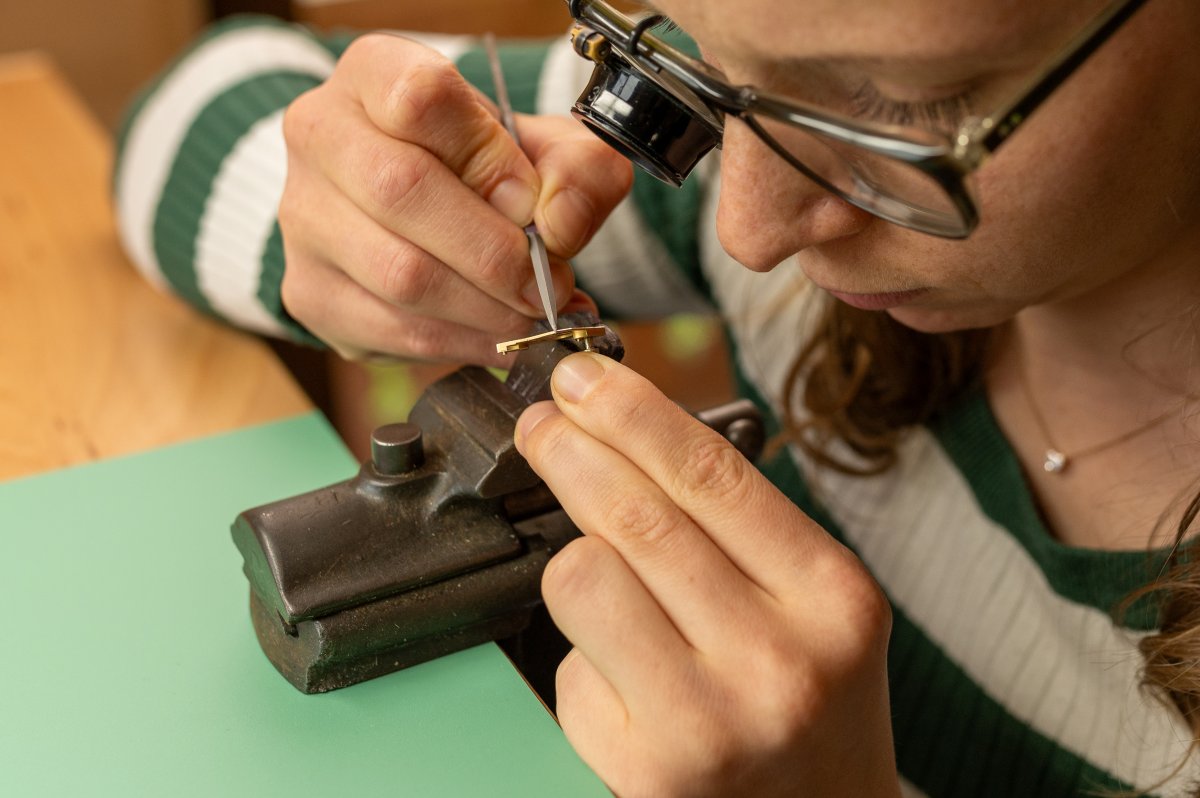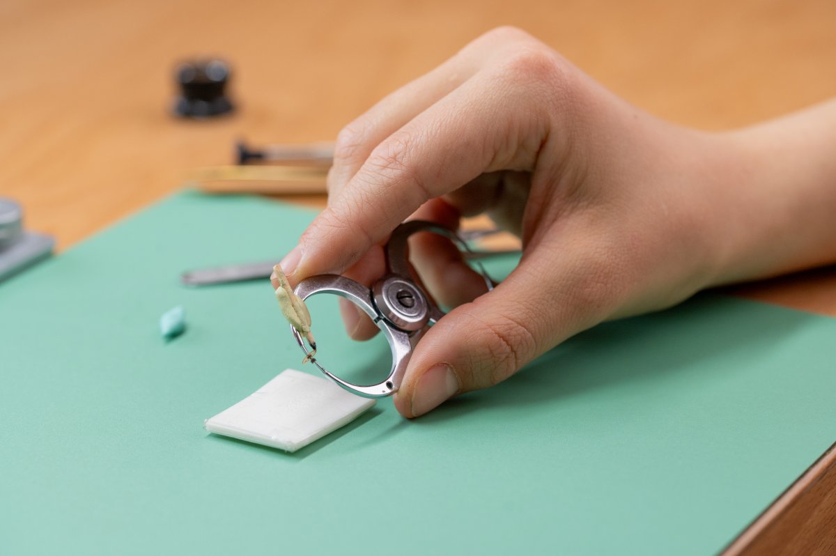 Ebauchage de l’angle à la lime puis finition à la main avec des pâtes à polir et des papiers abrasifs.